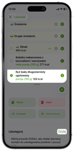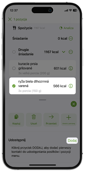 Wystarczy w jadłospisie zaznaczyć produkt, który chcesz udostępnić, kliknąć opcję „Dodaj” i wpisać adres e-mail osoby zarejestrowanej w aplikacji. Następnie produkt automatycznie pojawi się również w jadłospisie tego użytkownika.