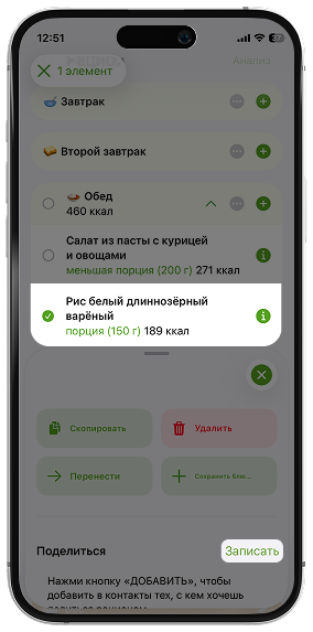 Достаточно в дневнике питания отметить продукт, которым вы хотите поделиться, нажать на опцию «Добавить» и ввести e-mail пользователя, зарегистрированного в приложении. После этого продукт автоматически появится и в его дневнике питания.
