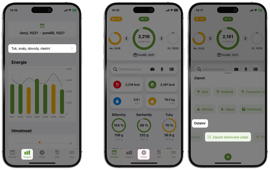Záznam sledovaných údajov nájdeš v sekcii Progres → Ďalšie údaje (tuk, svaly, obvody, vlastné).